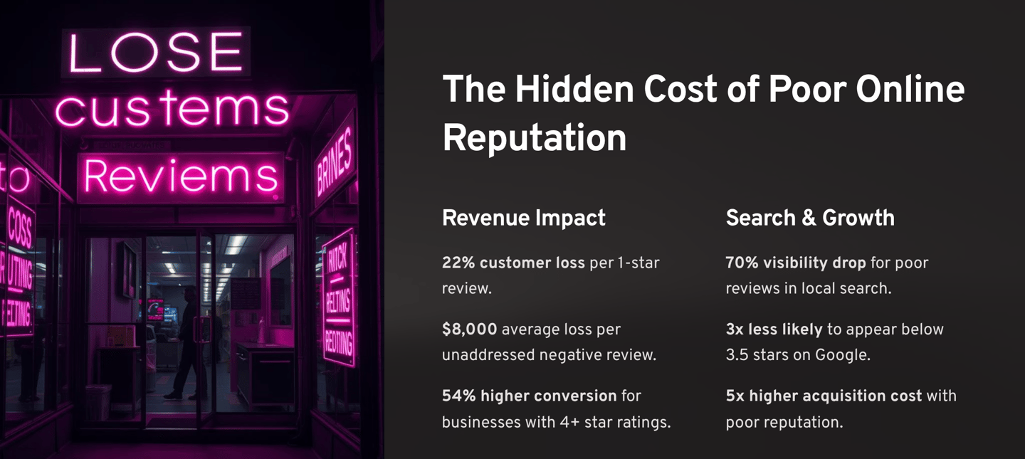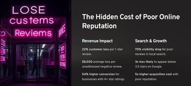 Before diving into solutions, let's examine exactly what poor reputation management costs your business. These numbers come from our analysis of over 10,000 businesses across 15 industries.