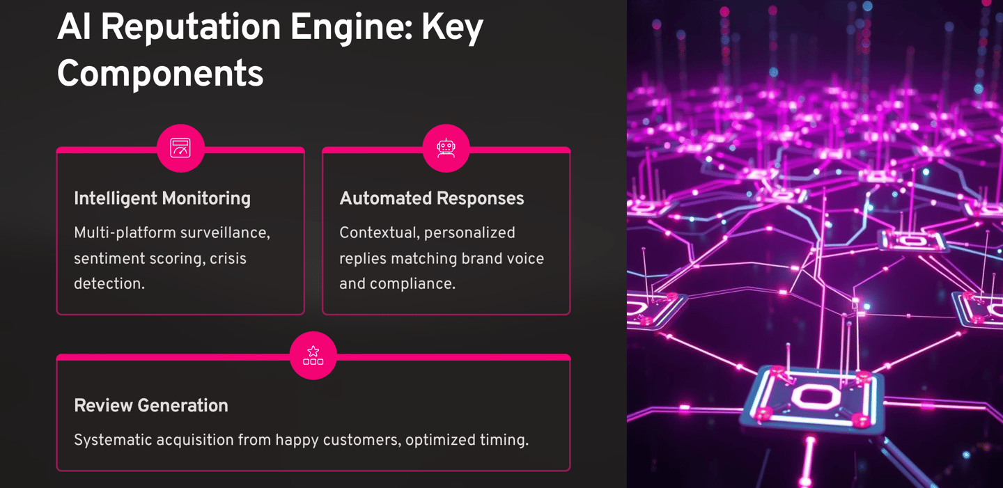 Modern AI reputation management systems consist of seven interconnected components that work together to create a comprehensive reputation growth engine.