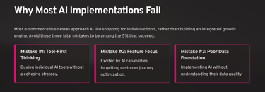 Mistake #1: Tool-First Thinking Instead of Strategy-First Planning They buy an AI chatbot here, a recommendation engine there, and wonder why their results are mediocre. Without a cohesive strategy, you're just adding expensive complexity to your business.